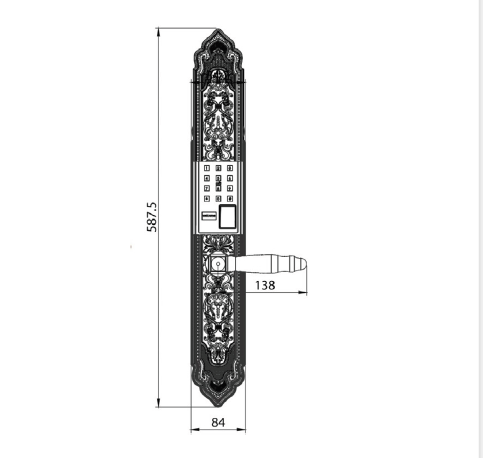 + Kích thước thân khóa ngoài: R84,5 x C710 x D34 mm